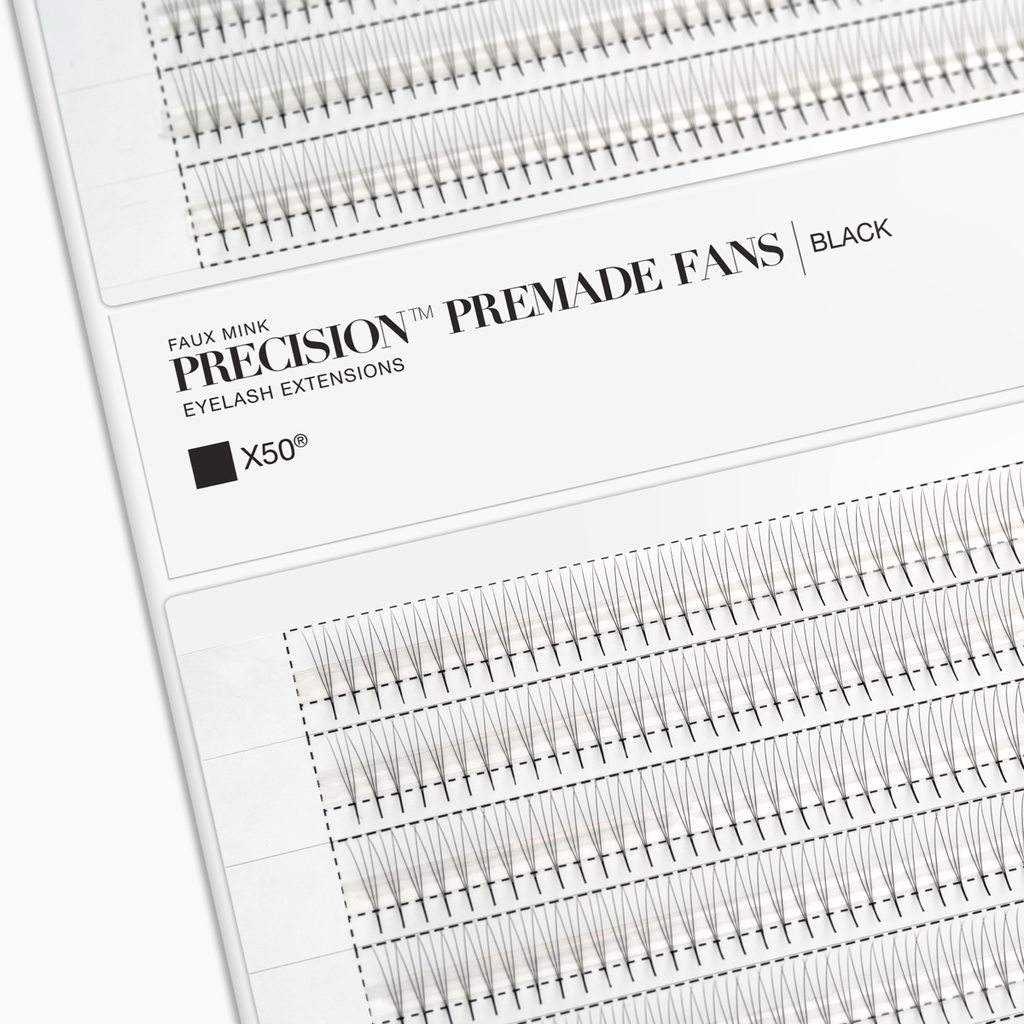 Precision™ Premade Fans -sarja hyödyntää huippuluokan Faux Mink -kuituja, jotka ovat silkkisen pehmeitä, kevyitä ja joustavia. Viuhkat on valmistettu tarkasti, jotta ne sulautuvat saumattomasti luonnonripsiin ja antavat pitkäkestoisen, näyttävän lopputuloksen.